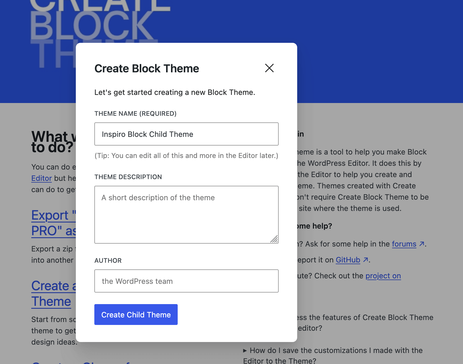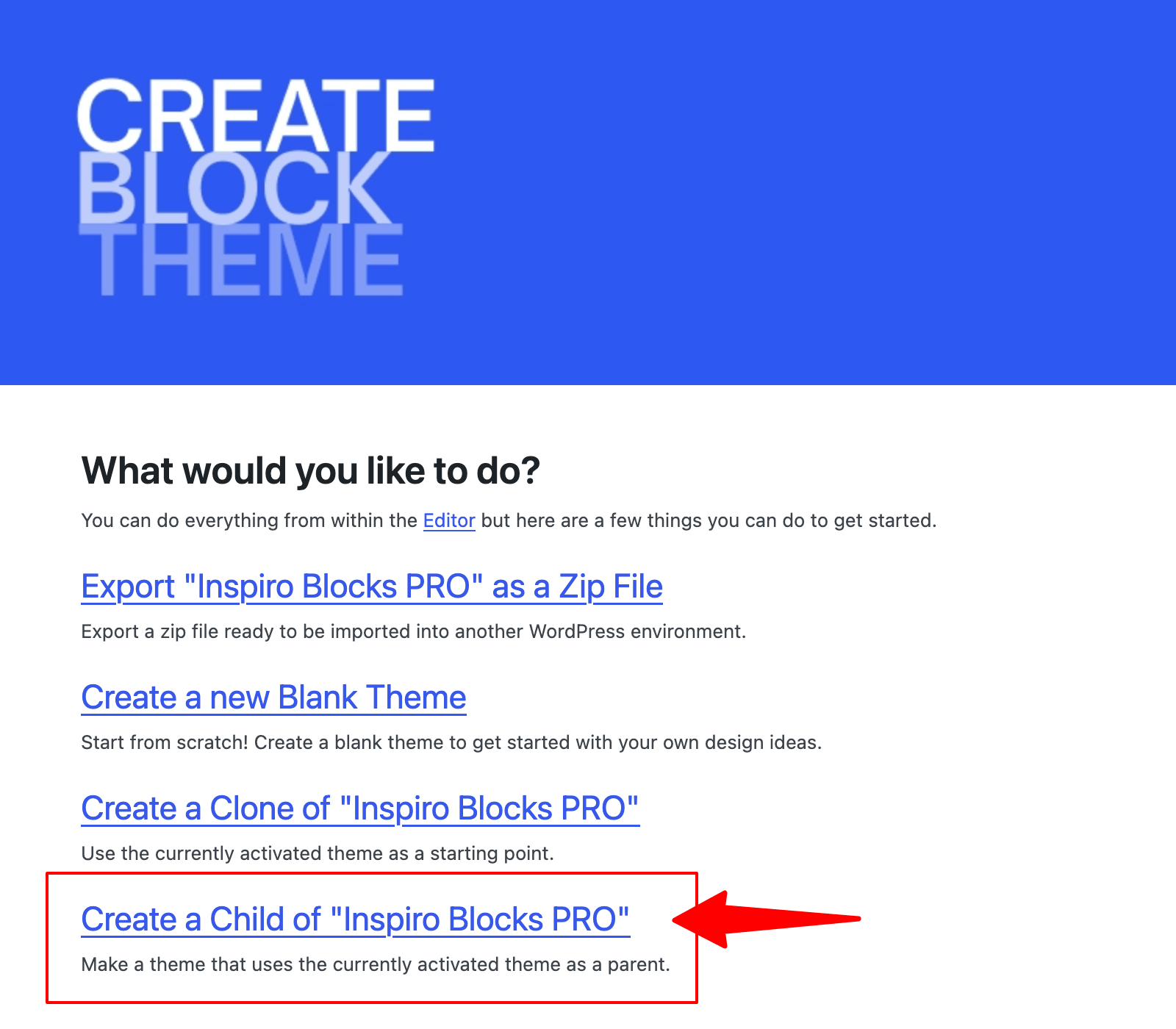 Use the plugin’s interface to generate a child theme for block-based themes.